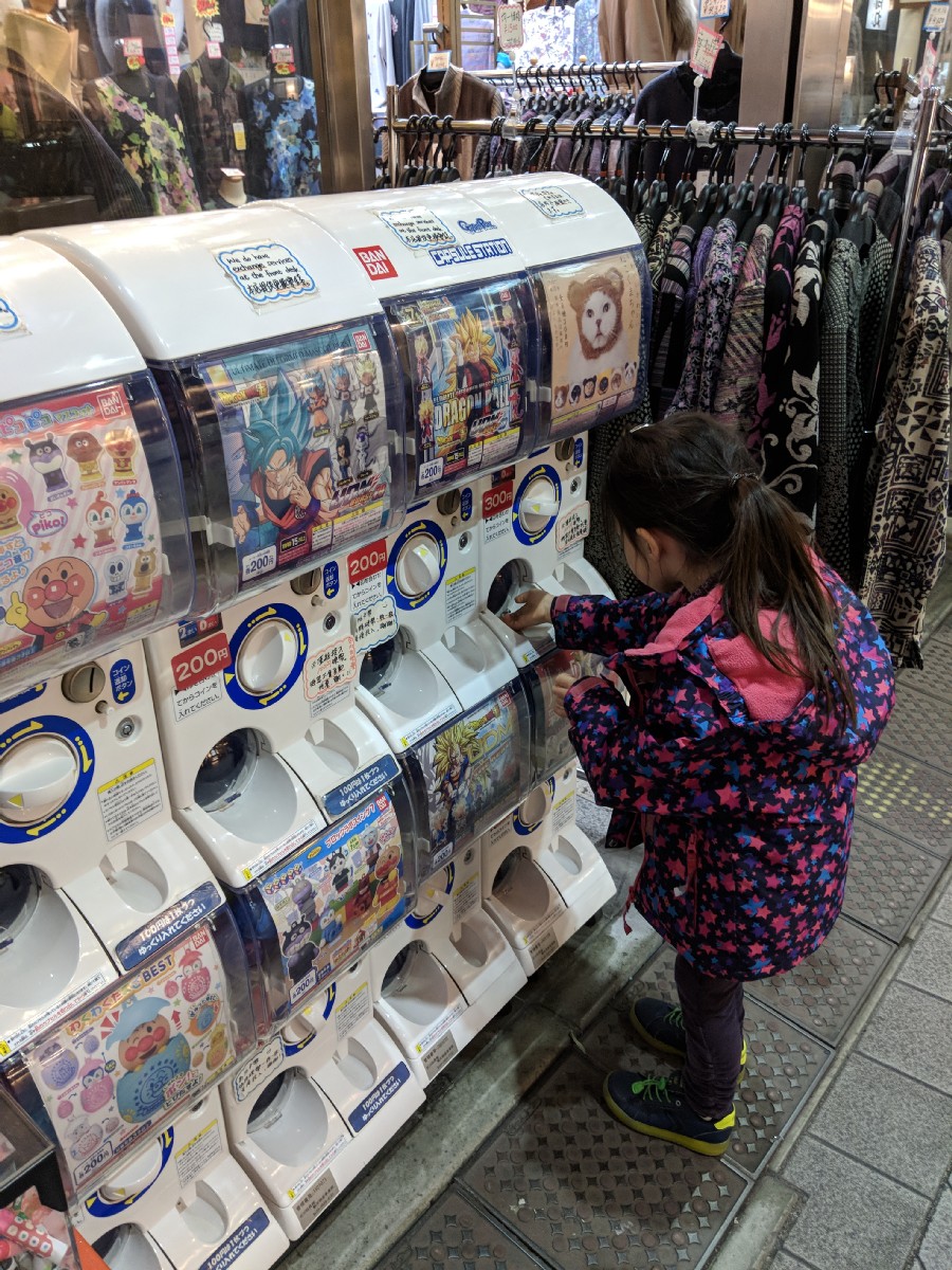 15:15:15 Tanaka-san and I made a new friend at Kamiya Bar and went on a tour of other bars in Asakusa (none were as good as Kamiya). | 18:10:36 I took over parenting in the evening so Chie could go out with her friends. Here's Erika being indulged with one of these "gacha gacha" machines. |
