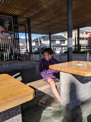11:36:49 | 11:37:00 | 12:00:40 Back at the hotel to pick up our luggage and wait for the bus the rest of Chie's family were getting back to Hiroshima. | 13:01:57 Erika having one final go in another foot spa next to the local station in Yuda-Onsen. |
