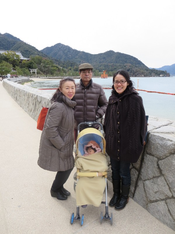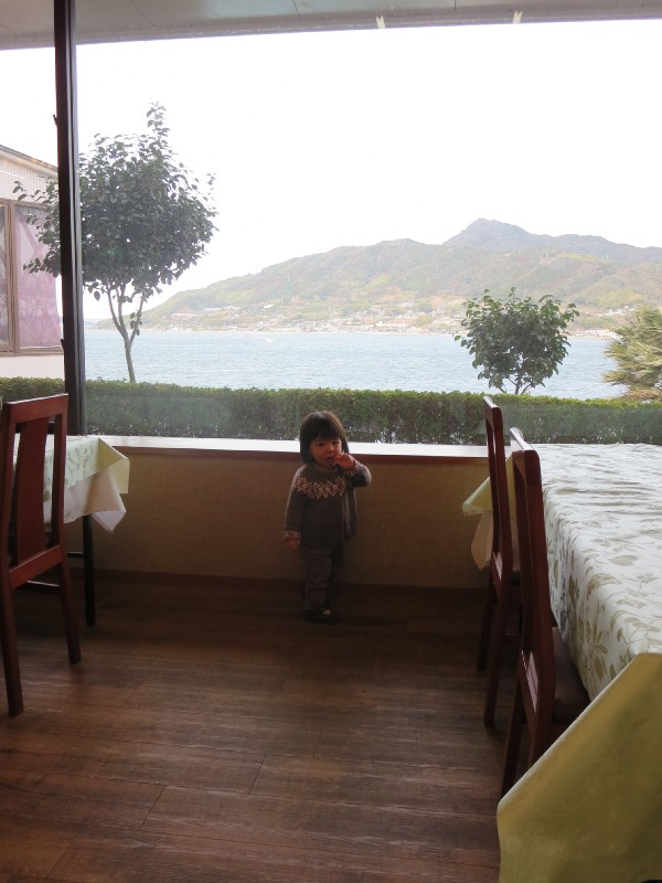13:06:22 Visiting Erika's other Great Grandmother. | 14:07:11 Back on the ferry to the mainland again. | 14:12:11 Erika eating her first ever momiji-manju on the ferry on the way back. | 14:47:19 We had a late lunch of udon at this place in Miyajima-guchi. |