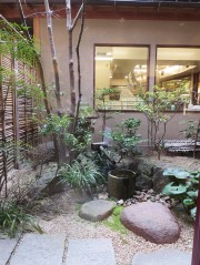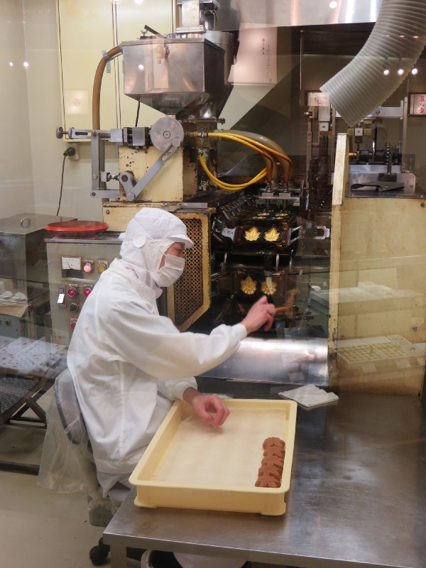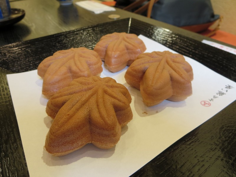 12:10:33 The little garden at Fuji-ya. | 12:12:04 The momiji-manju production line. | 12:12:16 | 12:13:41 Our freshly baked momiji manju with some green tea. |