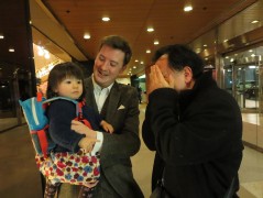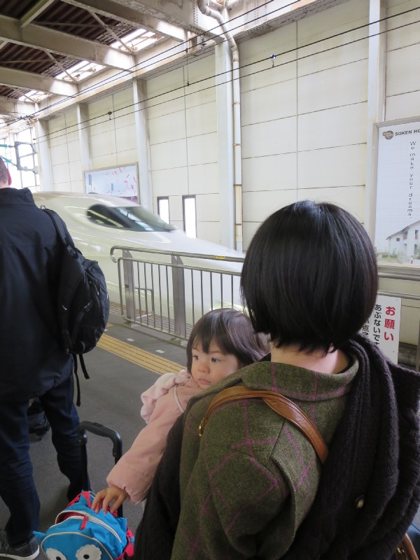 14:04:16 A shot of the three of us (and the salaryman across the aisle!) as Erika had her afternoon nap. | 14:41:53 Me and Erika on the shinkansen. | 16:18:21 Chie and Erika enjoying the ceiling in Tokyo station. | 17:00:52 In our room at the Hotel Okura, where we met up with Tanaka-san and Yuka-chan. |