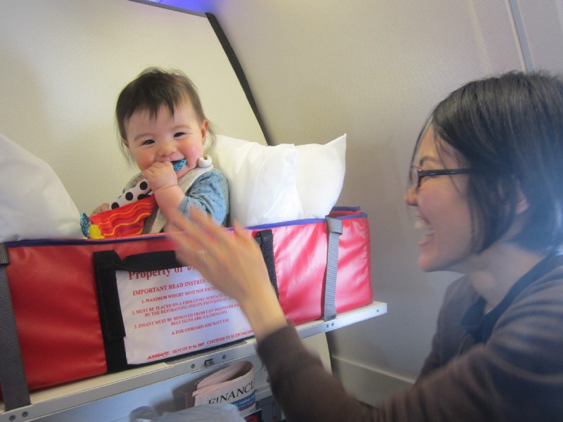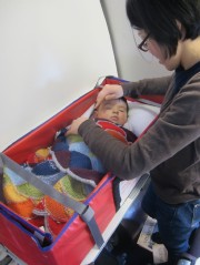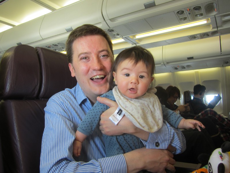 13:21:41 Erika in her Sky Cot - she actually seemed to quite like it here. | 13:44:35 Erika and her new toy we bought for the flight - fittingly named Gladys, as it's St. David's Day. | 13:55:13 Erika actually slept in her Sky Cot (albeit only for a few short spells). | 20:00:11 At the back of the plane, a picture of the three of us with one of the cabin attendants. |