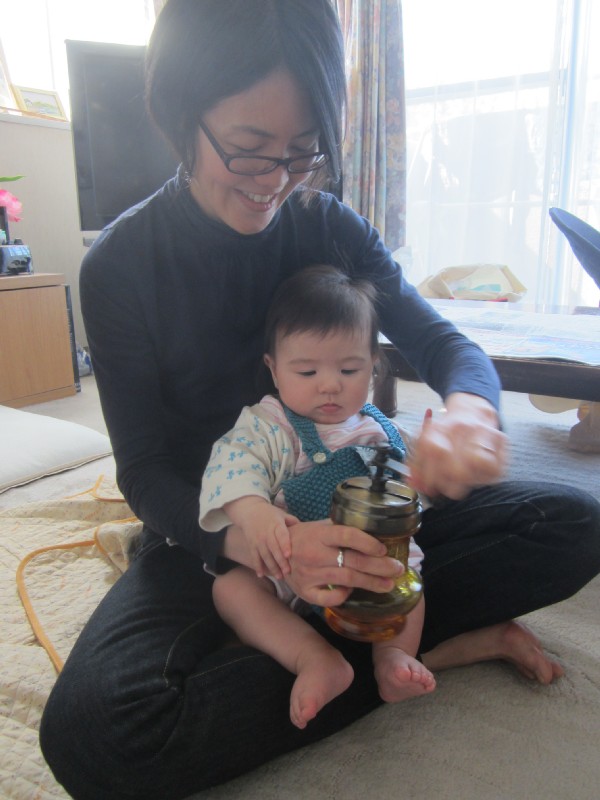 10:36:11 ...and giving me some advice on the computer. | 10:44:11 Tokyo Sky Tree omiyage I brought back from Tokyo. | 10:46:18 Erika wearing a sort of blanket / cape thing on her head. | 16:26:12 Erika visiting her Great Grandmother (Chie's Mum's Mum). |