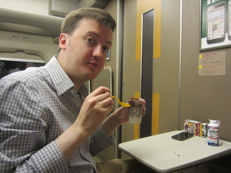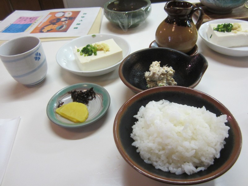 11:24:53 The kodama shinkansen at Hiroshima station. | 11:27:10 Erika's first time on the shinkansen! | 11:32:39 Me eating some cereal on the shinkansen. | 13:15:13 Lunch at a tofu restaurant in Okayama called Okabe. |