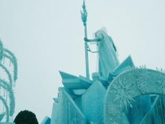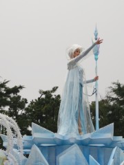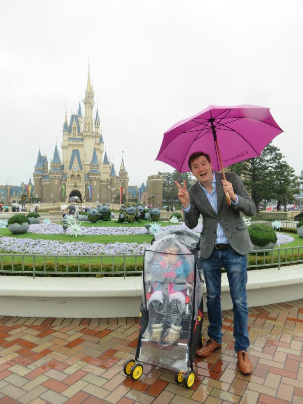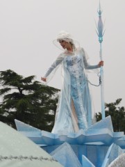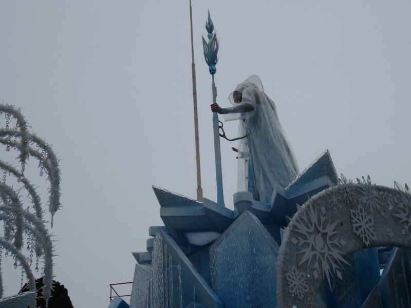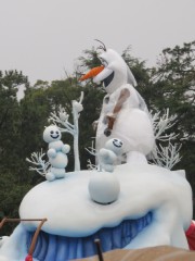 09:24:22 Me and Erika with the Disneyland castle in the backround - Erika is in a rented buggy, hidden under the rain cover, which we were required to buy for the princely sum of 3500 yen (about twenty quid). | 10:19:37 The main highlight of our visit was the Frozen parade - albeit a quicker than normal version, and looking a bit odd as the characters all had rain covers on. | 10:20:10 | 10:20:22 There's Olaf. |