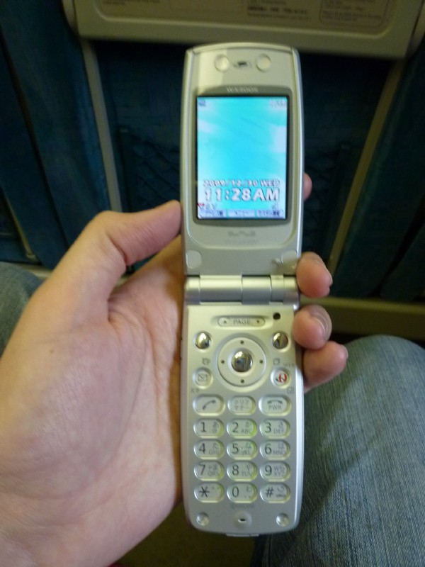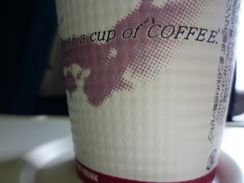 | 11:17:00 Me and Chie on the Shinkansen from Hiroshima to Kobe. | 11:22:45 A blast of nostalgia - this is the model of phone I had when I was living in Japan. | 11:40:02 Coffee cup on the Shinkansen: "I'm going WEST with a"... |