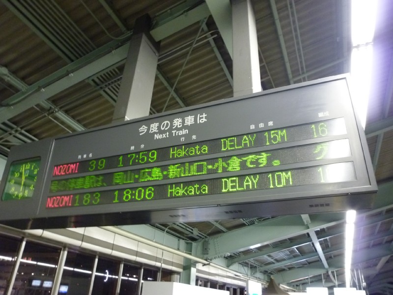 | 14:06:35 Note the bedsteads here. | 16:47:33 Kobe as seen from across the water as the light starts to fade. I rather like this picture, albeit on a bit of a slant. | 17:56:48 Our Shinkansen back to Hiroshima was delayed!!!!! |