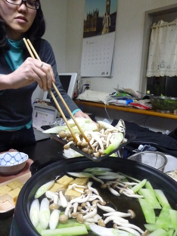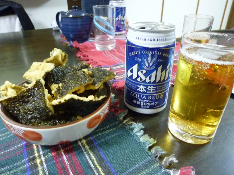 | 17:51:49 Back at Chie's family's home - some deep fried nori tempura and some Asahi Aqua Blue. | 19:26:16 Chie helping out with tonight's dinner: nabe. | 19:26:22 |