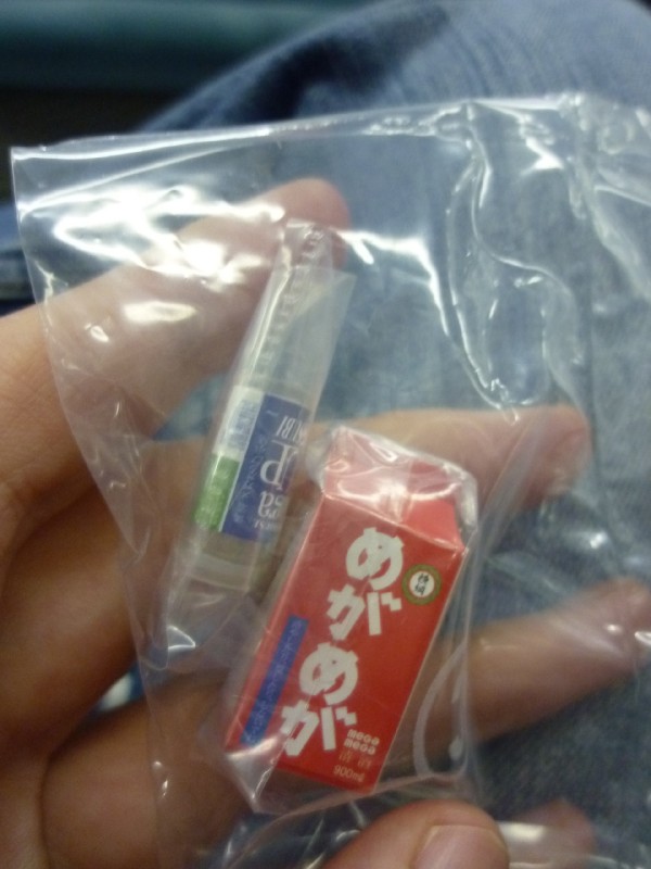 | 17:43:11 A couple of miniature toy sake containers. | 17:43:37 ...a sake bottle? | 17:44:24 I think these are little sake cartons too. |