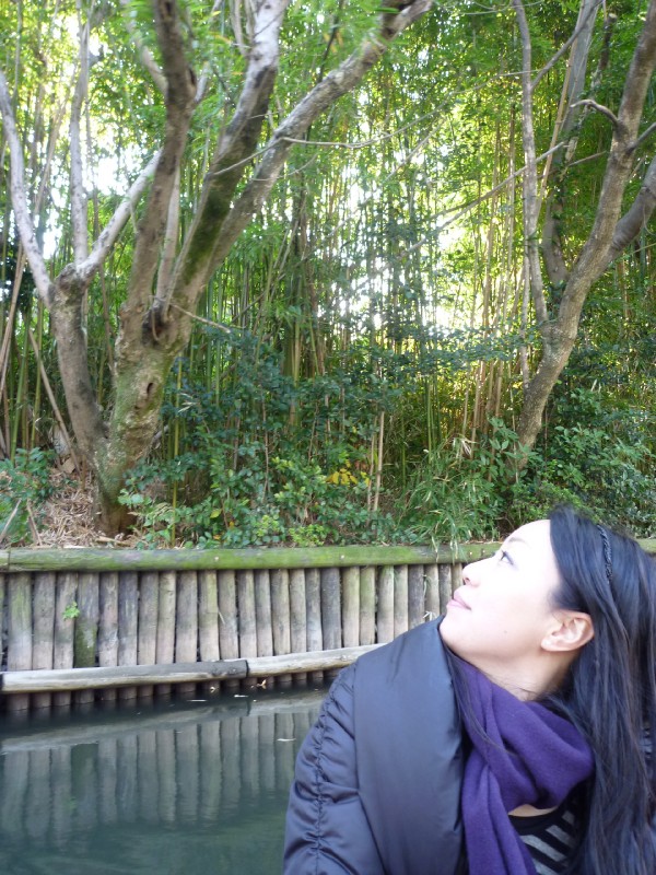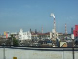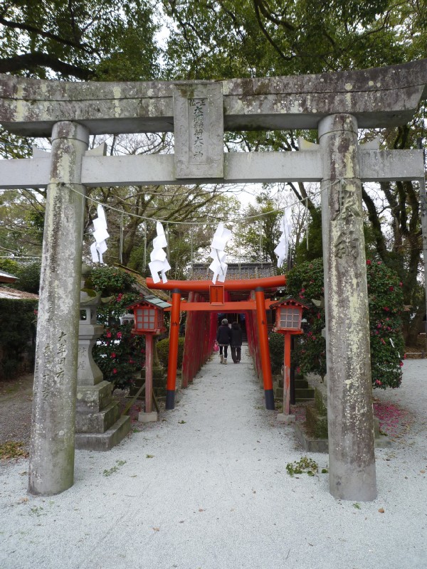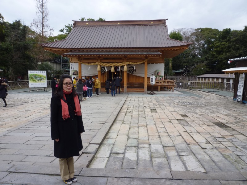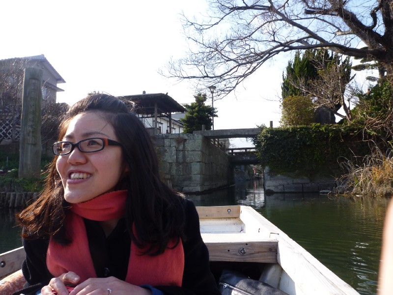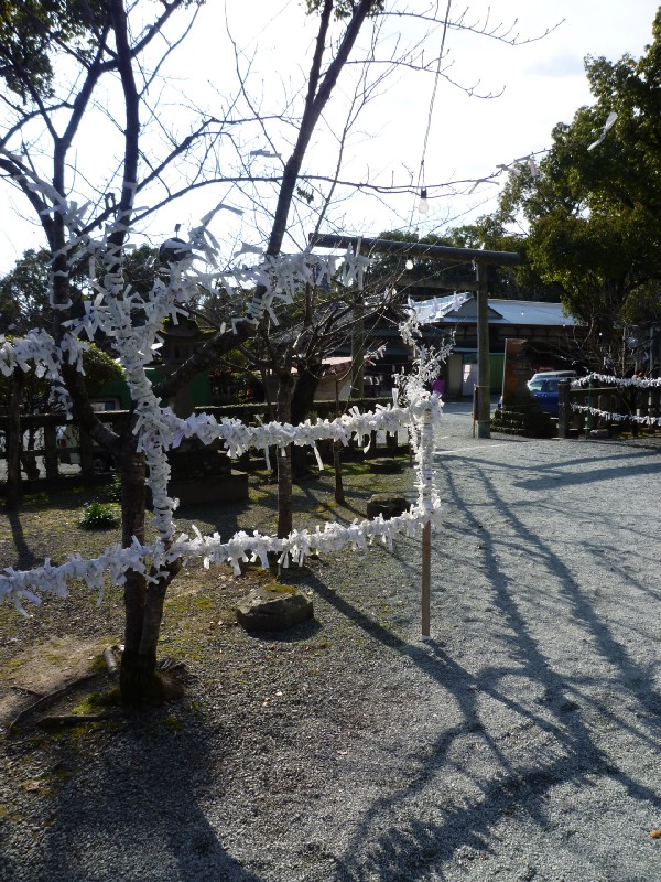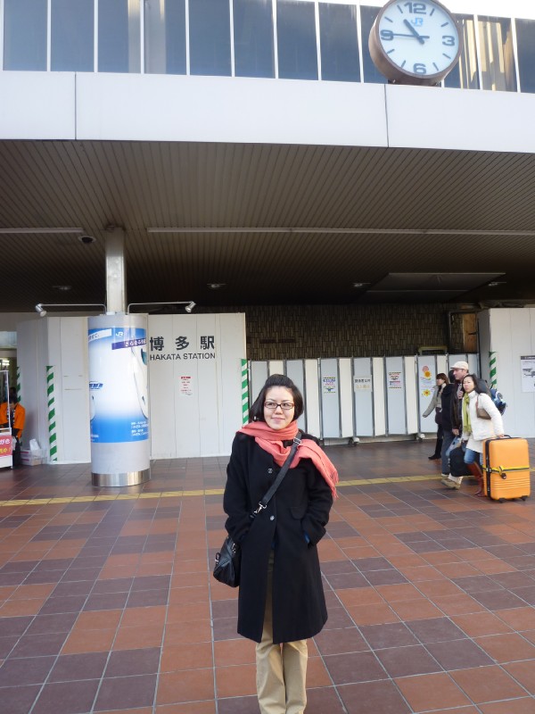 | 10:15:24 On the Shinkansen on the way to Hakata - very industrial looking! | 10:44:15 Here's Chie at Hakata station. | 13:14:57 Now in Yanagawa, visiting the shrine from where the donkobune start from. Note all the messages tied to the tree here - a New Year's tradition. |