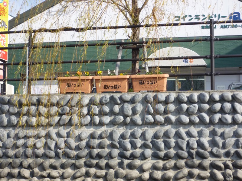 | 14:13:37 Another boat passesd by. | 14:16:55 The stenciled message on these flower boxes reads "hana ippai" - "lots of flowers"! | 14:19:36 |