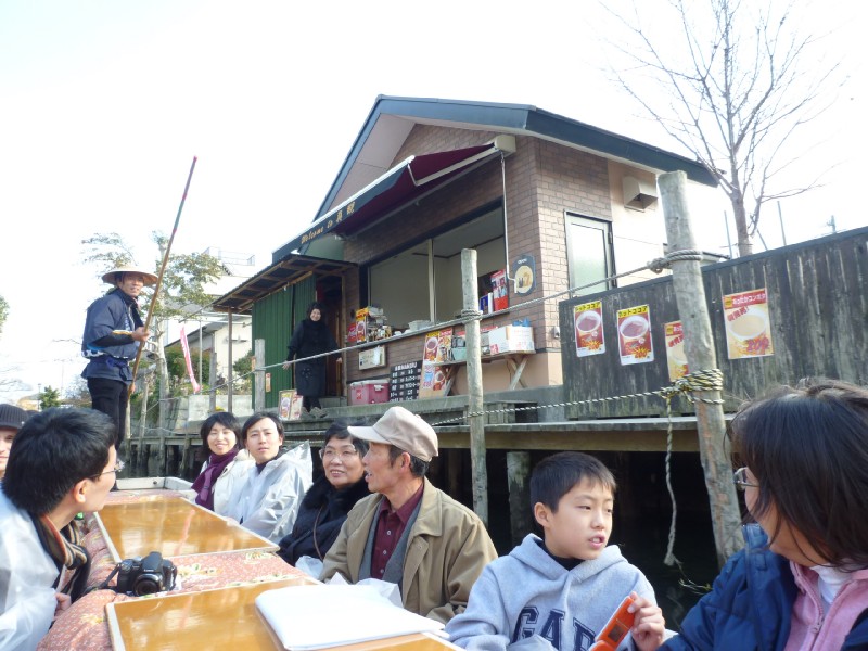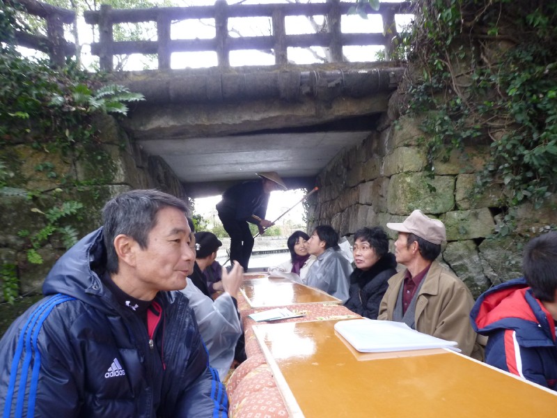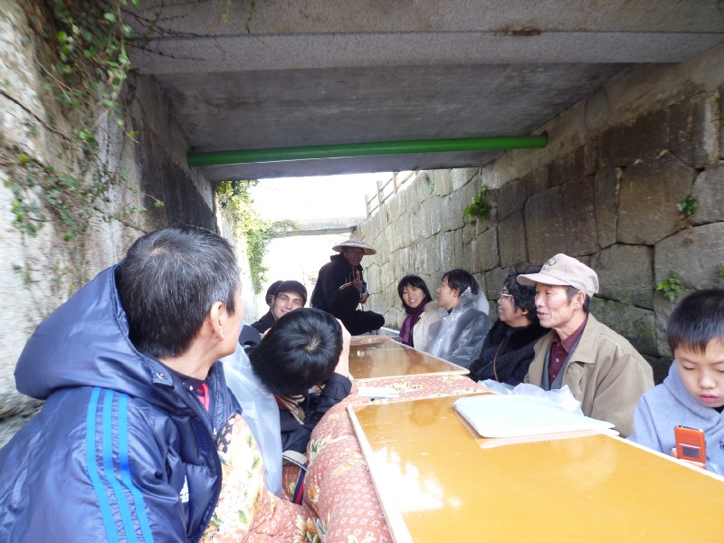 | 13:50:17 | 14:12:53 On the boat now. Note the little "kotatsu" a little table with a blanket on top and heating underneath - to keep your leg warms. | 14:13:04 There's the boatman doing his job. |