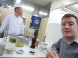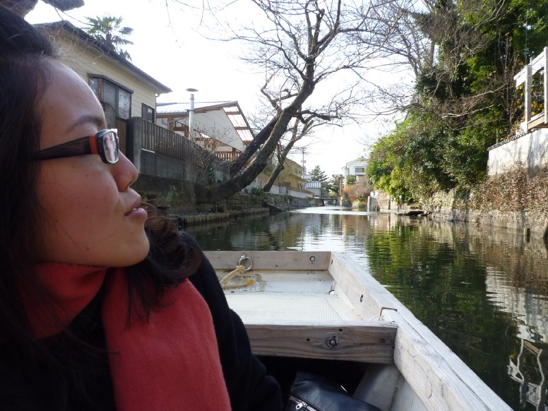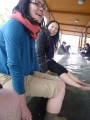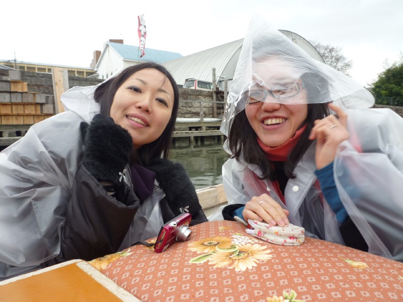 | 15:19:31 Another nice looking riverside restaurant. Must be lovely here in nicer weather! | 16:16:39 After getting off the boat, a bit later on we found an onsen (hot spring) where we could bathe our feet. Very much appreciated given the weather! | 16:16:52 Me and Chie enjoying the hot water. |