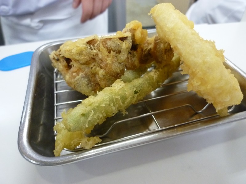 | 18:36:12 Shimeji mushrooms, erengi (green beans) and renkon (ltous root). | 18:36:25 Tempura was very good here - and really cheap - my vegetable tempura set cost a mere 670 yen - about 4 pounds. | 18:40:25 ...also some onion, aubergine and pumpkin now. |