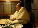 | 20:00:31 Outside that bar, with the large barrel from which they were serving sake. | 20:18:12 This is in Ran-tei now, Tanaka-san's friend's place. Tatami and sliding doors - it doesn't get much more Japanese than this! | 20:21:12 Me and Tanaka-san in Ran-tei. |
