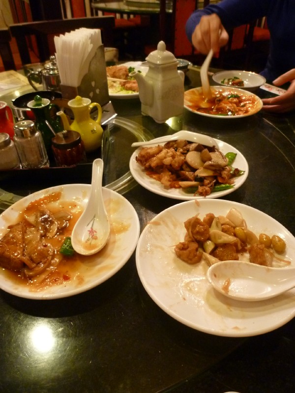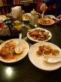 | 20:37:00 Some more excellent dishes, including vegetarian chicken with ginko nuts, a very nice tofu dish (the details of which escape me), and tempura mushrooms with vegetables in black bean sauce. | 21:21:56 The owl statue in Ikebukuro - a popular meeting spot in the station. One (probably incorrect) derivation of the meaning of Ikebukuro (池袋) is "owl pond" - fukuro (or bukuro) being the Japanese for owl. | 23:05:26 The three of us in Quercus. |