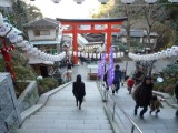 | 14:57:47 On Enoshima now - the steps leading up to the main shrine. | 14:58:40 Again, as seen from the side. | 15:00:38 One of the shrine buildings and a flag. |
