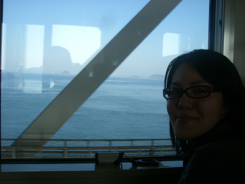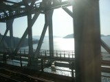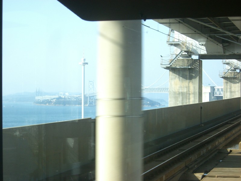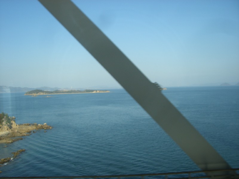 | 15:35:45 The train we got on from Okayama to Shikoku (unfortunately we didn't get to sit in this rather swanky double decker carriage). | 16:07:42 One of the highlights of going to Shikoku was taking the train over the Seto-ohashi - one of the world's longest bridges. | 16:07:53 ....unfortunately it is a bit hard to take pictures of it while you're actually on it! |