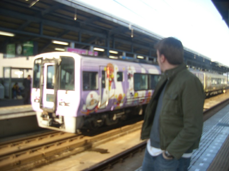 | 16:39:10 ...and then we decided to get back on the train again - here's a very blurry picture of me with an Anpanman train. | 16:39:19 ...by the time the camera had remembered how to focus the train had pretty much gone. | 16:41:25 There were some pretty excellent vending machines (自動販売機 in Japanese) in Sakaide... |
