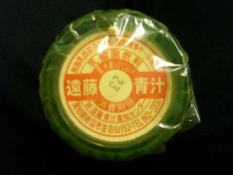 | 18:20:28 The last 小有豆 (broad bean preserved in soy sauce) - apparently another regional speciality (although, despite being a huge fan of both broad beans and soy sauce I wasn't particularly keen on these). | 19:01:46 On the train on the way back to Honshu (the "mainland", if you can call it that) now. Chie picked up this very strange green drink to have on the train. | 19:02:08 ...and wanted to take numerous pictures of the bottle... |