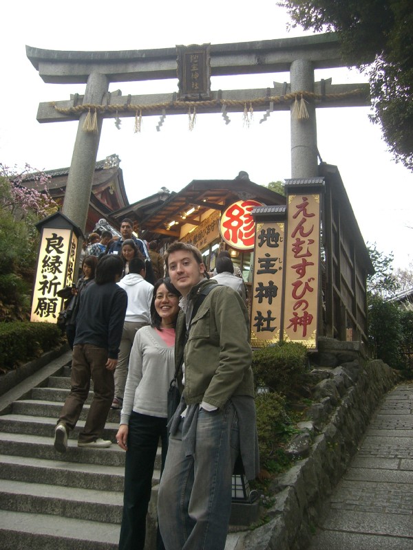 | 16:38:33 ....some nice earlier blooming trees here though - maybe plum? | 16:54:51 Having left Kiyomizu temple we took a wander through the charming little streets of Kyoto - I quite like this picture of Gilihad peering over Erina's shoulder. | 17:00:53 Gili-chan and Erina again. |