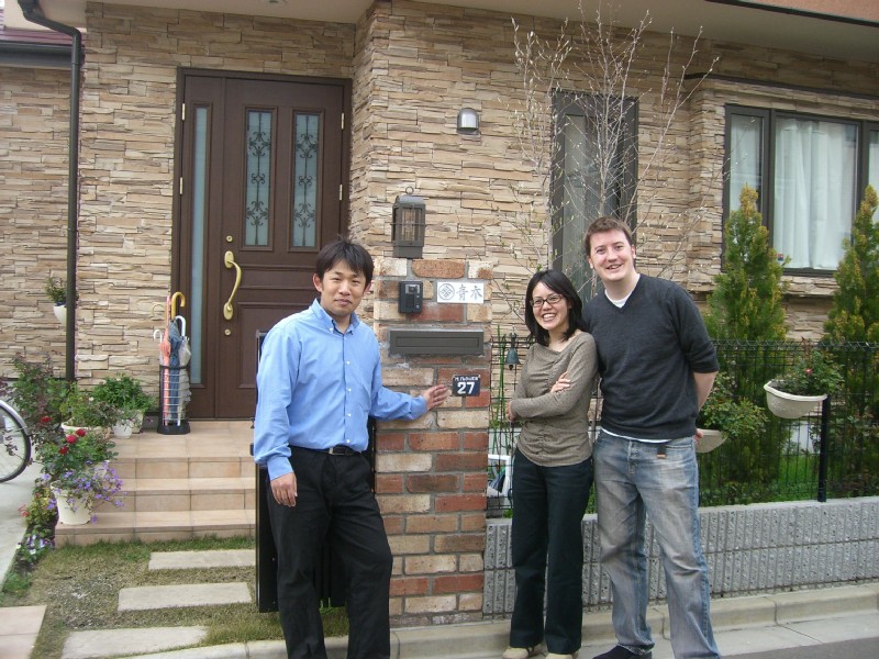 | 13:58:56 A little later on, in Chofu, where we were going to be staying with my friend and former colleague Aoki-san, and his wife Kirilche-san. | 13:59:11 Me, Chie and Aoki-san and front of their new home. | 14:03:23 Aoki-san was particularly proud of this luscious green grass. |