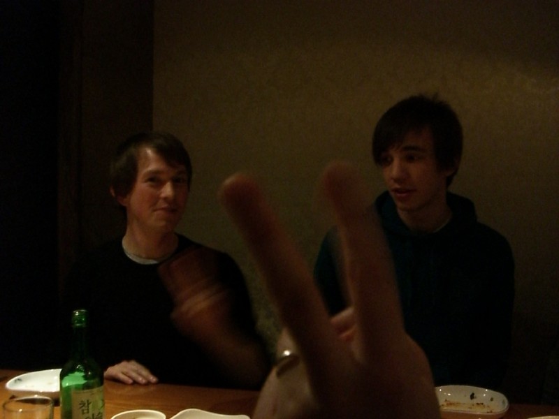 | 22:06:44 In Asadal, there's a murky Gav and Kyle in the background, with some sign language in the foreground. Oh, and like many of the pictures this evening there's a bottle of jinro in shot. | 22:07:03 Leon had been drinking since lunchtime apparently (Chie on the other hand hadn't). | 22:10:19 The chaps tucking into some excellent Korean food - and there's a bottle of Jinro in shot again. |