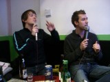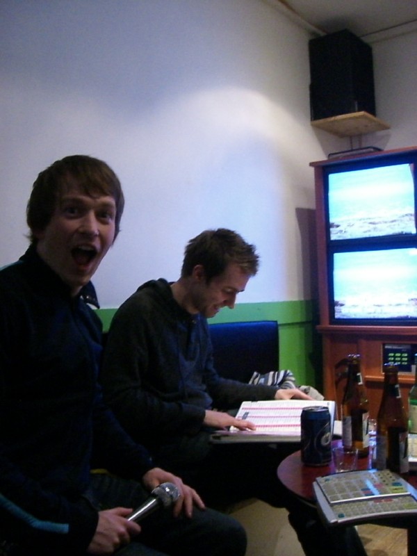 | 00:06:48 Gav has OB there I believe, whilst Stew appears to prefer Hite. Oh, and there's a bottle of Jinro in shot. | 00:13:15 Leon and Gav really going for it. Note the bottle of Jinro in shot. | 00:23:01 Gav and Stew seemingly doing a somewhat more soulful number. Oh and note the Jinro. |