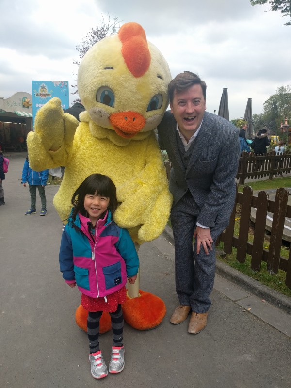 14:11:30 Chie and Erika on the rollercoaster. | 14:15:10 Me and Erika meeting the fairground's mascot. | 14:21:49 Erika on the dodgems. | 14:28:44 Erika on a sort of plane ride. |