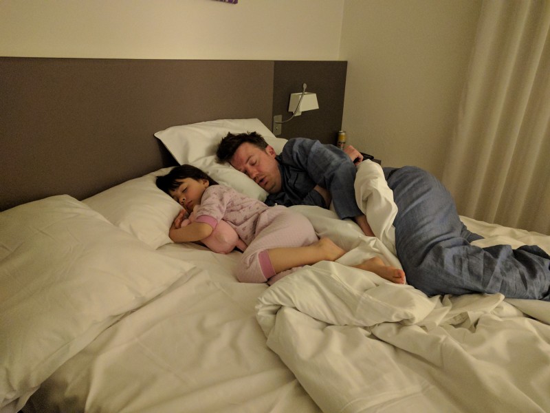 19:05:56 Me and Erika having ice cream. | 20:08:40 Heading back through the EuroLille shopping centre again, and Erika wanted another go on these cars. | 22:37:33 I fell asleep getting Erika to sleep. |