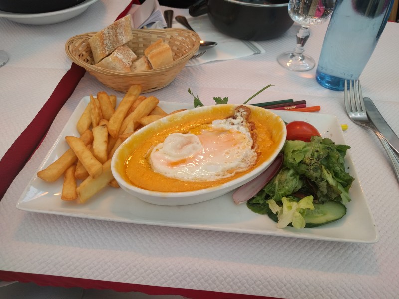 13:50:27 Chie and Erika outside the place where we had lunch. Unfortunately my phone camera partly mangled this one. | 13:50:58 My lunch - "Un Welsh" - essentially a bowl of melted cheese, with a fried egg on top. And chips. At least they didn't go overboard on the salad dressing. | 14:27:44 Me having a coffee at the end of lunch and Erika drinking some water. | 14:27:45 |