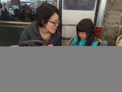 12:12:06 Erika and Chie at the market at Place Sebastopole. | 12:41:12 Erika in the Palace des Beaux Arts. | 12:45:16 Me and Erika in the museum cafe. I rather like this picture. | 12:56:25 Chie and Erika going down to the loos! Quite a dramatic staircase. |