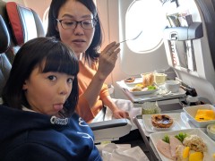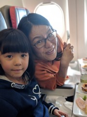 11:50:04 The three of us on the plane just before take off. | 12:56:39 Chie and Erika on the plane having their lunch. The food wasn't that good. | 12:56:48 | 13:27:01 The sparkling wine we had with lunch was pretty awful - I couldn't finish it - so I went with something safe and ordered some Port instead. |