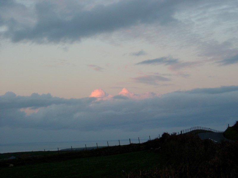 Two little cloud cumulations here stick out from the main raft, illuminated by the last rays of the sun, and look a bit like mountain peaks.