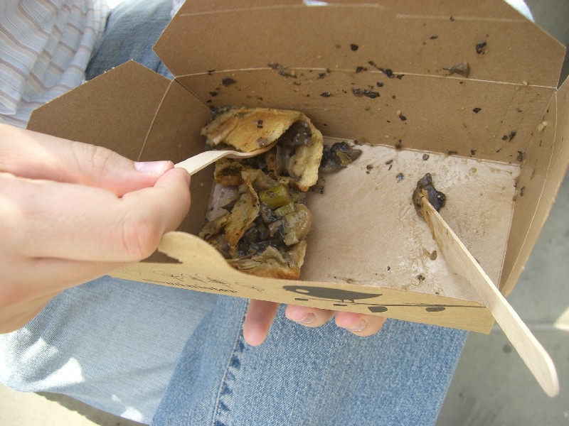 | 12:14:20 This is me standing in front of the King's Road market, the second of the two markets we went to today (the other one being the slightly less posh Pimlico Road market). | 12:15:49 I bought this pie from the Pieminster stand... | 12:20:11 ....here I am carefully considering its relative merits... |