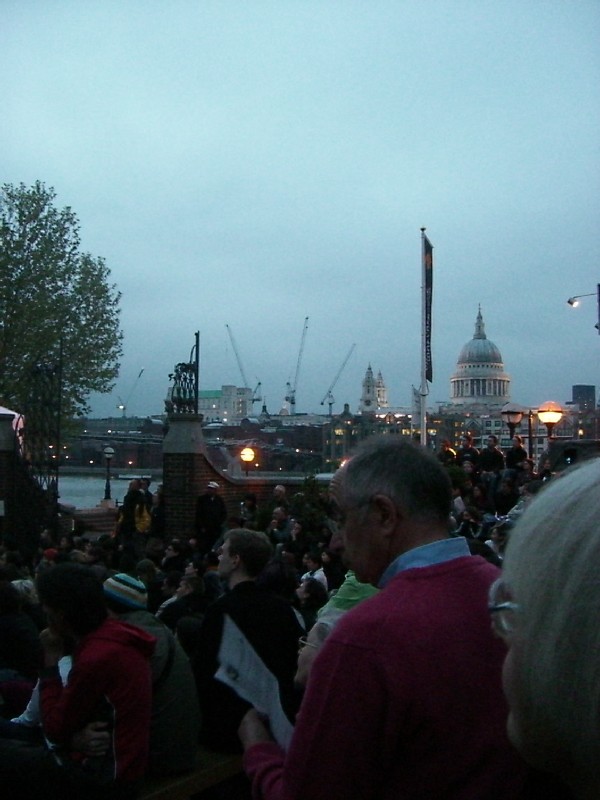| 20:20:17 A view across the audience, and out over the river to St. Paul's. | 20:30:48 This is a scene from a Midsummer Night's Dream. It looked reassuringly just as daft done 100 years ago as it does today. | 20:52:45 After the performance we went for a bit of a stroll along the Thames, which was very nice lit up by night. |