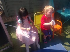 13:34:54 | 14:12:08 On arrival in Harpenden we met Kyle, Hannah et al at the pub, where there was a bouncy castle. | 14:31:44 The kids taking a much needed break from the exhausting work of bouncing. | 16:17:42 Back at Kyle and Hannah's place now, having ice creams in the garden. |