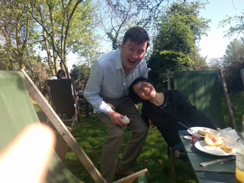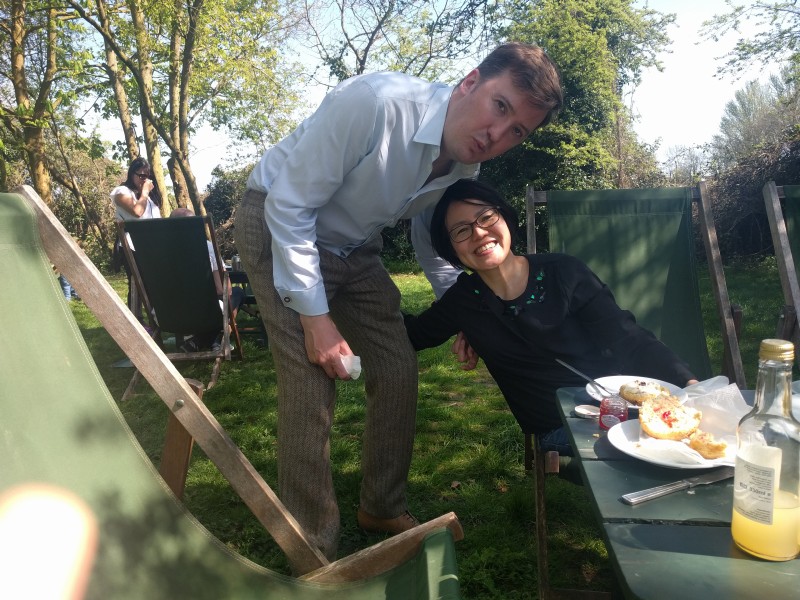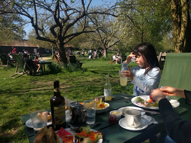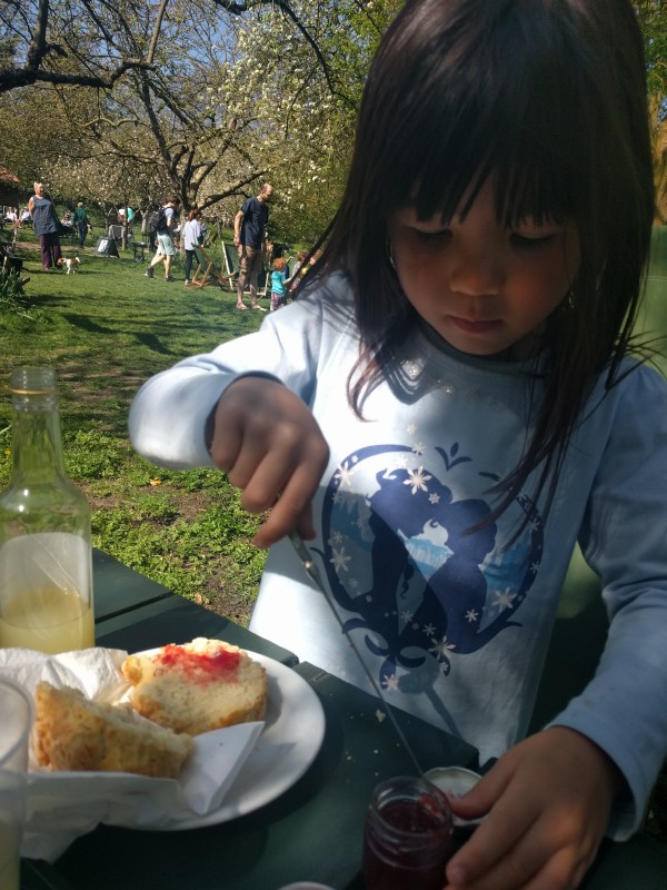 12:43:35 | 13:13:49 After a ridiculously long wait in the queue to order food, I finally got back to our table with scones which we ended up eating as a sort of starter because the savoury food would be a further wait. | 13:16:14 Erika digging into the jam. | 13:16:26 Me and Erika enjoying the Orchard. |