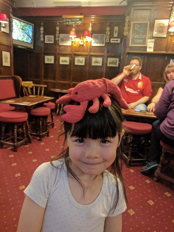 12:04:16 Erika outside the Red Lion. | 12:12:32 Erika inside the Red Lion with various nuts. | 12:42:28 Erika with a lobster on her head. | 17:54:44 Trying to decide which GevCham to open with dinner. |
