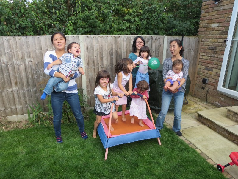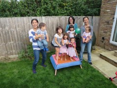 15:24:16 I took Erika away from the party for a bit, ostensibly to get her to have an afternoon nap. Unfortunately she spotted a playground. | 15:24:21 After a few goes on the swings I managed to get her back in her buggy, and she did eventually go to sleep. | 17:06:34 Chie and her friends from the company she used to work for in Maidenhead, with their respective offspring. | 17:06:38 |