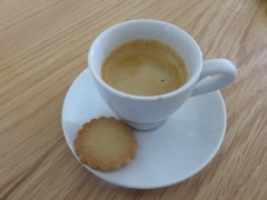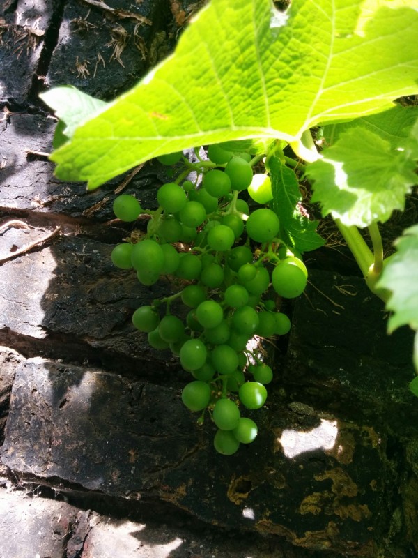 09:06:48 Espresso and one of those inexplicably nice little biscuits from Poilaine. | 09:07:04 Erika at breakfast. | 10:28:44 The grapes on our vine. | 10:28:49 Better picture of the other bunch. |