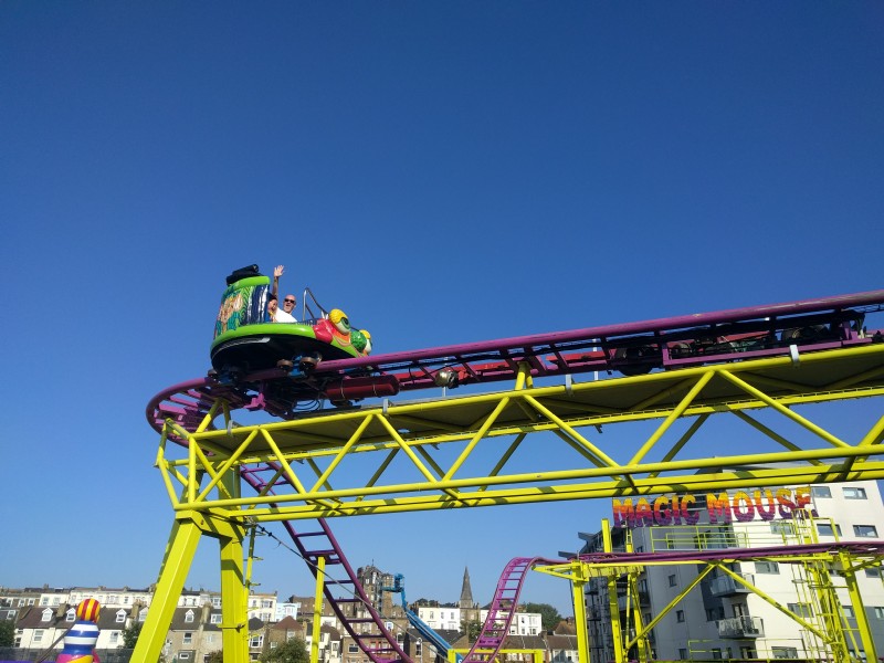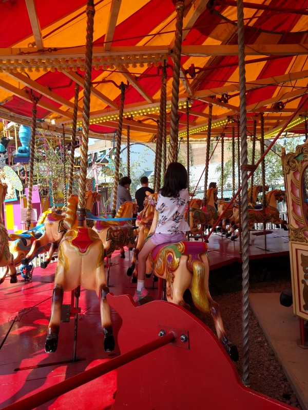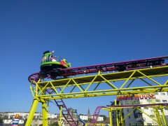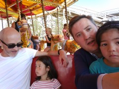 10:21:53 Slight mishap with the tickets on the way out. | 12:41:00 Aiko and Erika on the Beehive rollercoaster. | 12:41:04 | 13:25:00 Me, Leon, Mei and Erika on the carousel, the girls not really looking like they're enjoying themselves! |