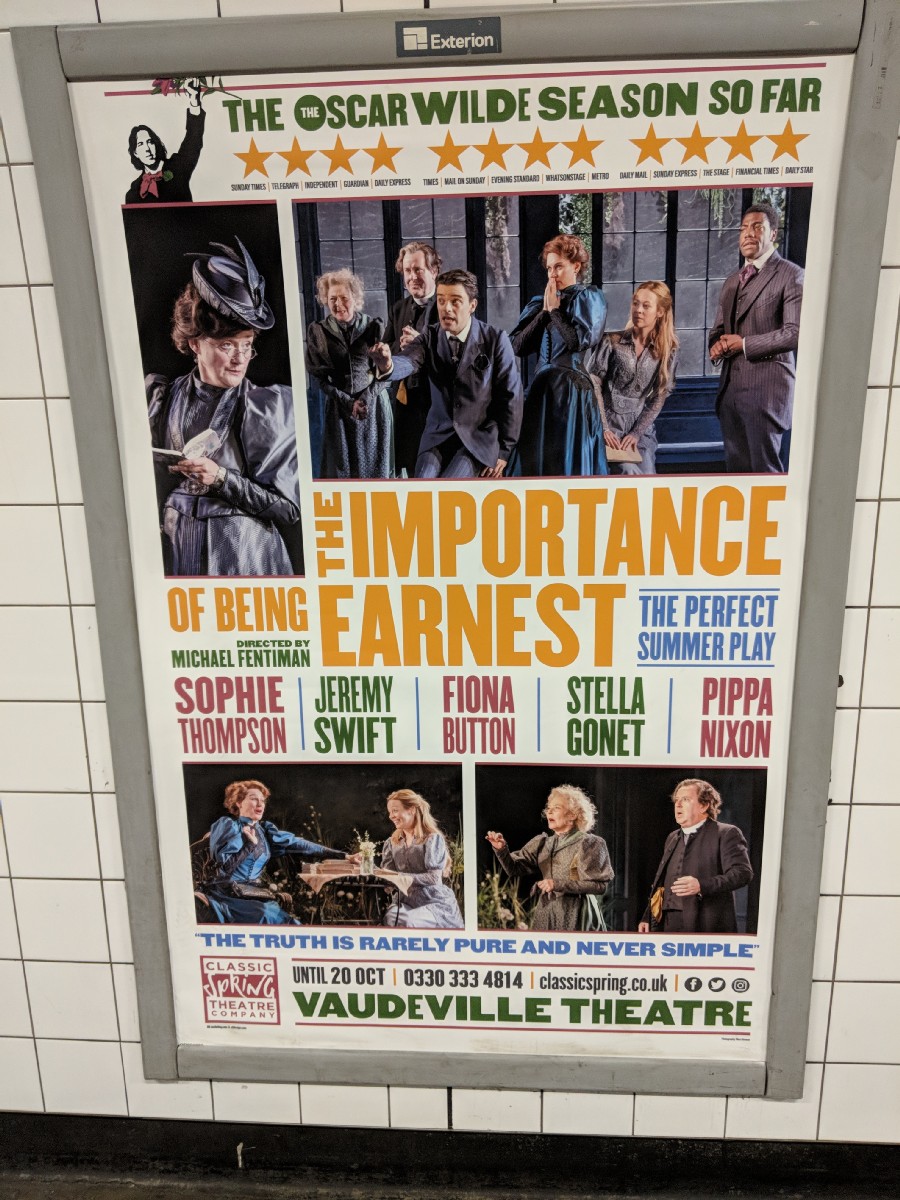 13:22:40 Spotted this collection of dinosaurs (presumably free to a good home) on my way back from lunch. | 23:49:34 On the way back from seeing Kyle and Al I spotted this poster for The Importance of Being Earnest. Apparently Al has seen it about 800 times and is bored to death of it. |