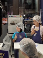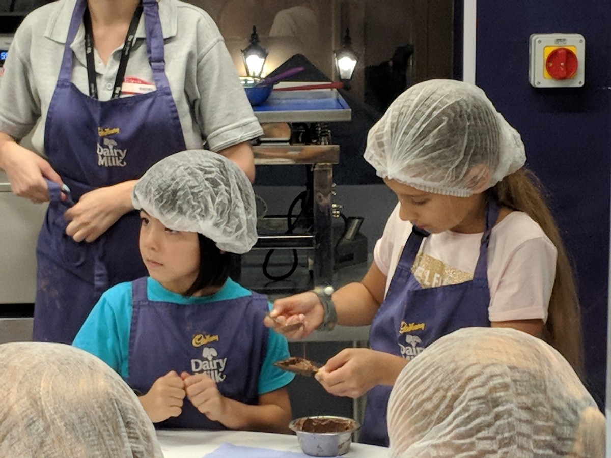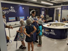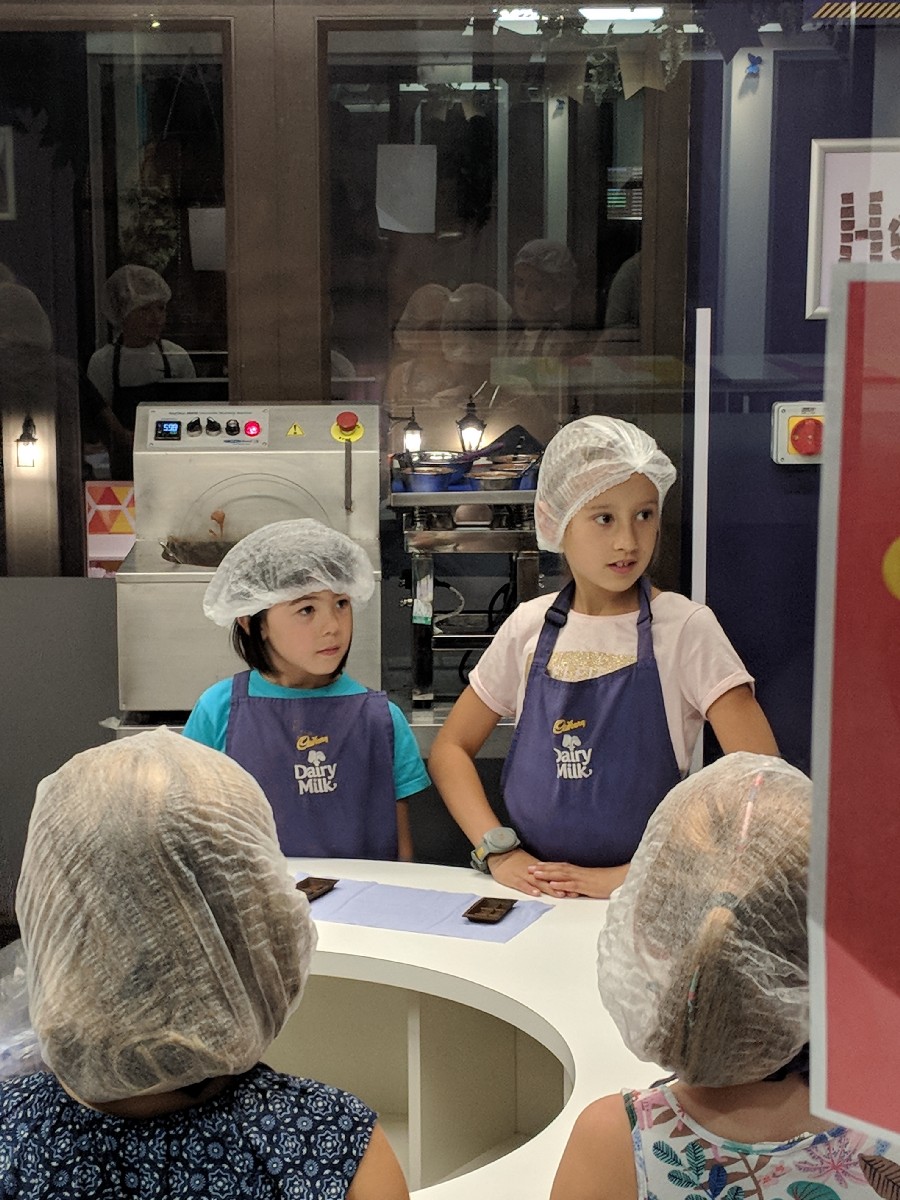 12:25:05 Erika with the police dog. | 13:08:33 After a bit of lunch Erika went to work in the chocolate factory. | 13:08:37 | 13:08:45 |