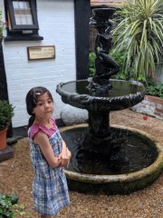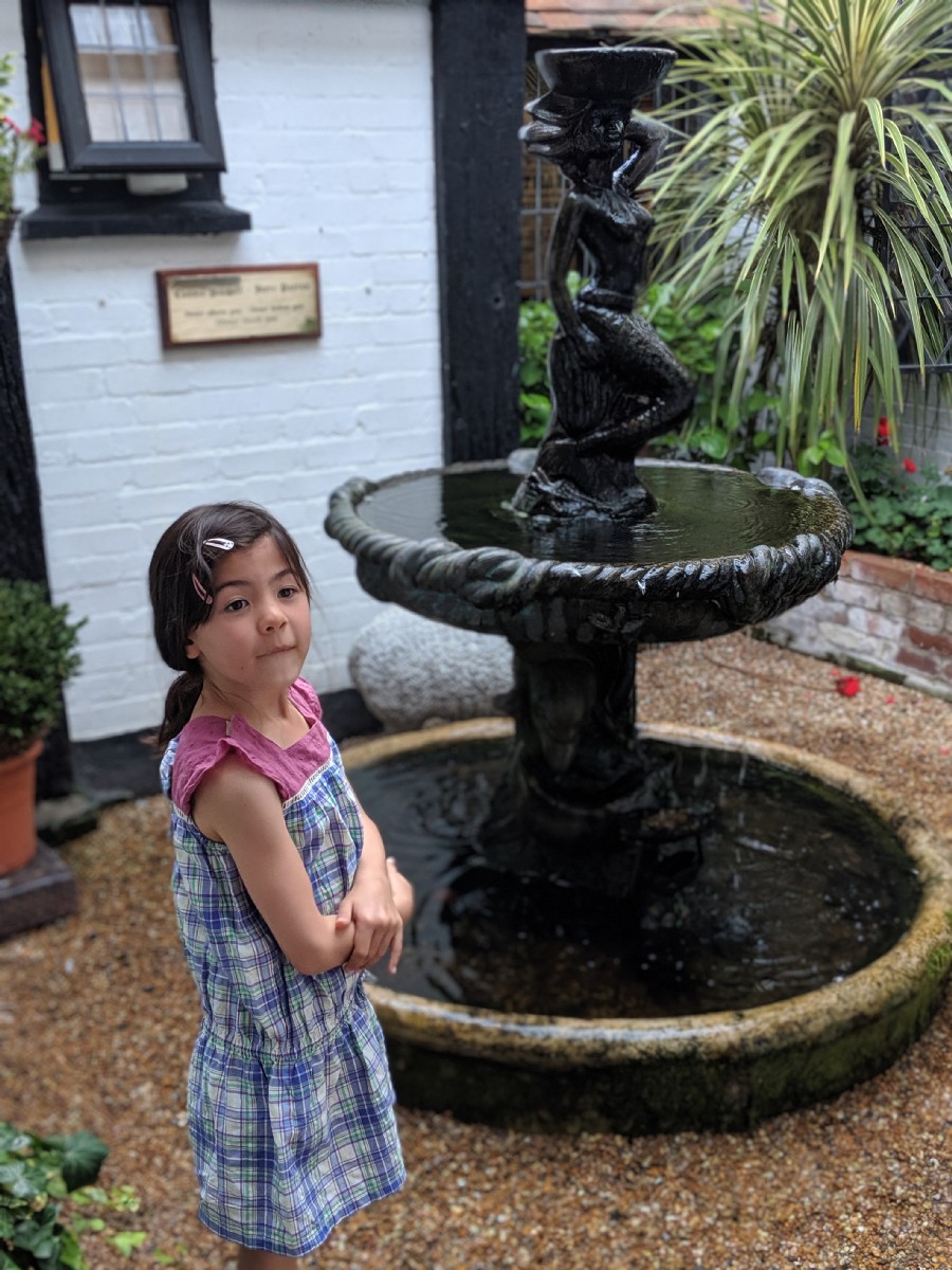 18:16:55 The pretty little courtyard inside the Mermaid. | 18:31:31 Erika in the courtyard looking at the fountain. | 18:31:40 Erika and the fountain. | 18:33:54 Erika back in the bar finishing up her drink. |