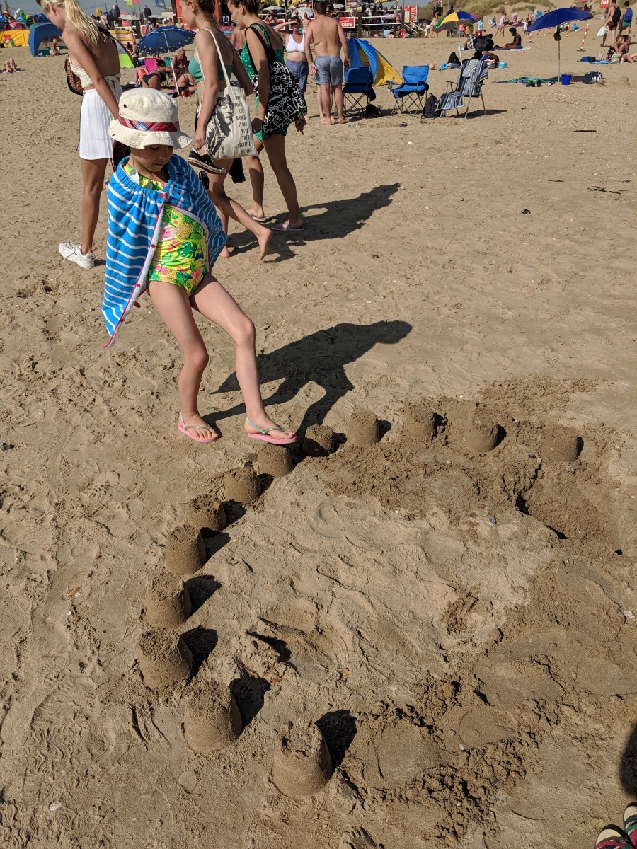 14:57:43 Erika and her Slush Puppy. | 14:59:39 Terrifyingly blue. | 15:39:41 I made a circle of sand castles which Erika then proceeded to demolish. | 15:44:45 Back in the sea again. |