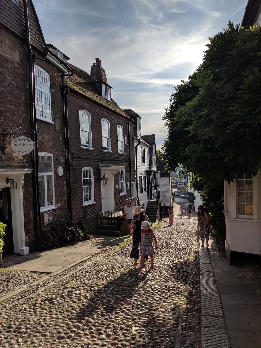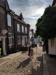 16:33:31 Last shot before we persuaded Erika to leave the beach, and just managed to squeeze on an absolutely packed bus back to Rye. | 18:01:06 In Rye now, on the cobbled street where the Mermaid is (which is in fact called Mermaid Street). | 18:02:14 | 18:10:57 Inside the Mermaid. |