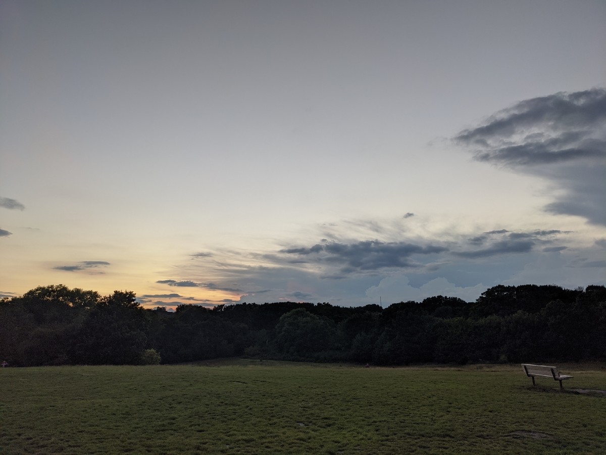 18:38:56 Surveying the state of the weather earlier in the evening. | 20:18:11 Heading onto the heath to find a nice spot to sit. | 20:18:56 The usual view with the bandstand. | 20:20:41 The London skyline through the trees. |