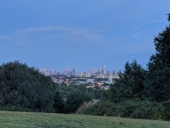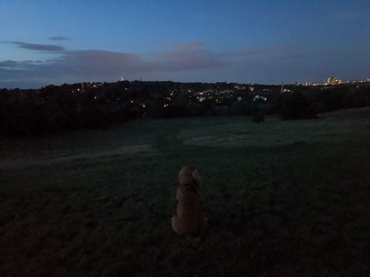 20:44:53 | 21:05:11 Eventually Jeremy joined me and we moved to a different spot to sit. You can just about make out Jeremy's dog here. | 22:03:43 Nightfall over Highgate. | 22:03:59 I think I was attempting to use Night Sight mode on my camera - obviously a bit useless without a tripod. |