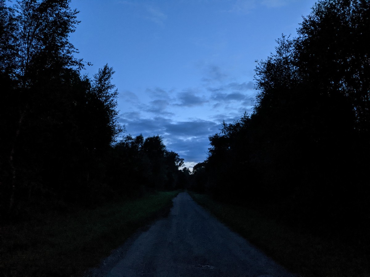 04:57:27 Piles of timber by the track side. | 04:58:52 The moon still visible. | 05:02:15 Heading down the hill. | 05:02:22 |